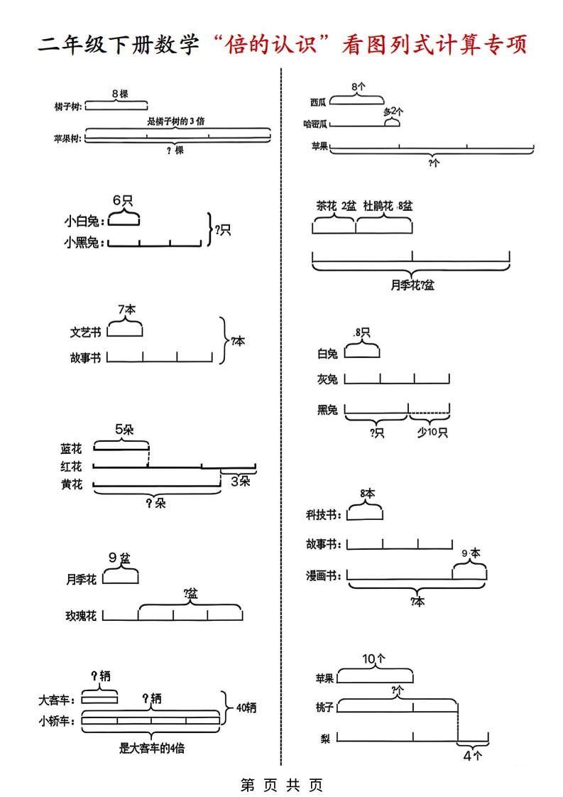 二年级下数学“倍的认识”看图列式计算专练