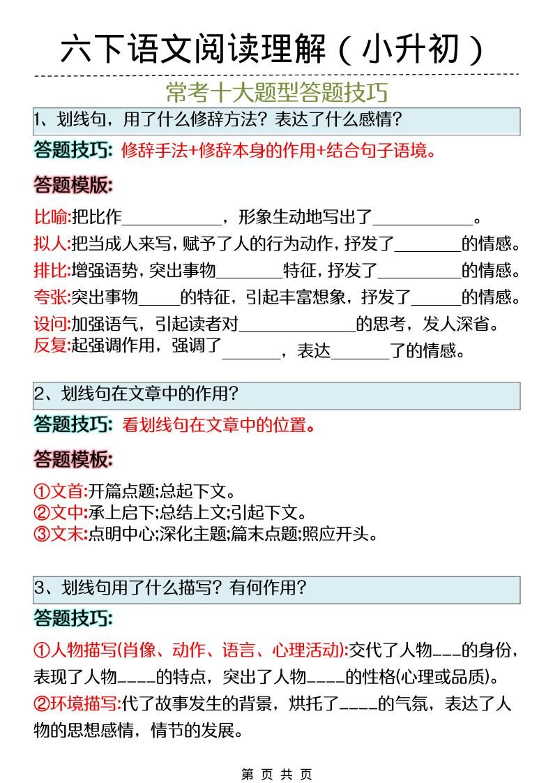 六年级下语文阅读理解答题技巧(小升初)