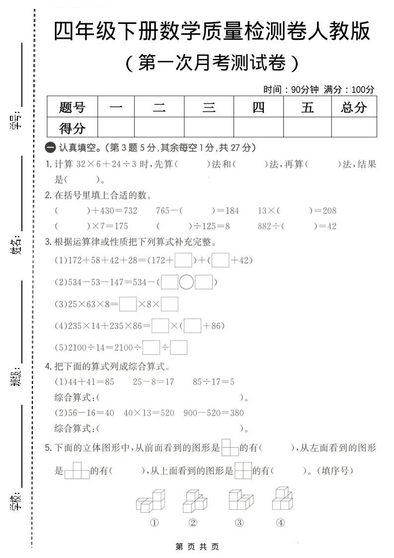 当前位置:首页学科年级四年级四年级下数学第一次月考质量检测卷《人教版》