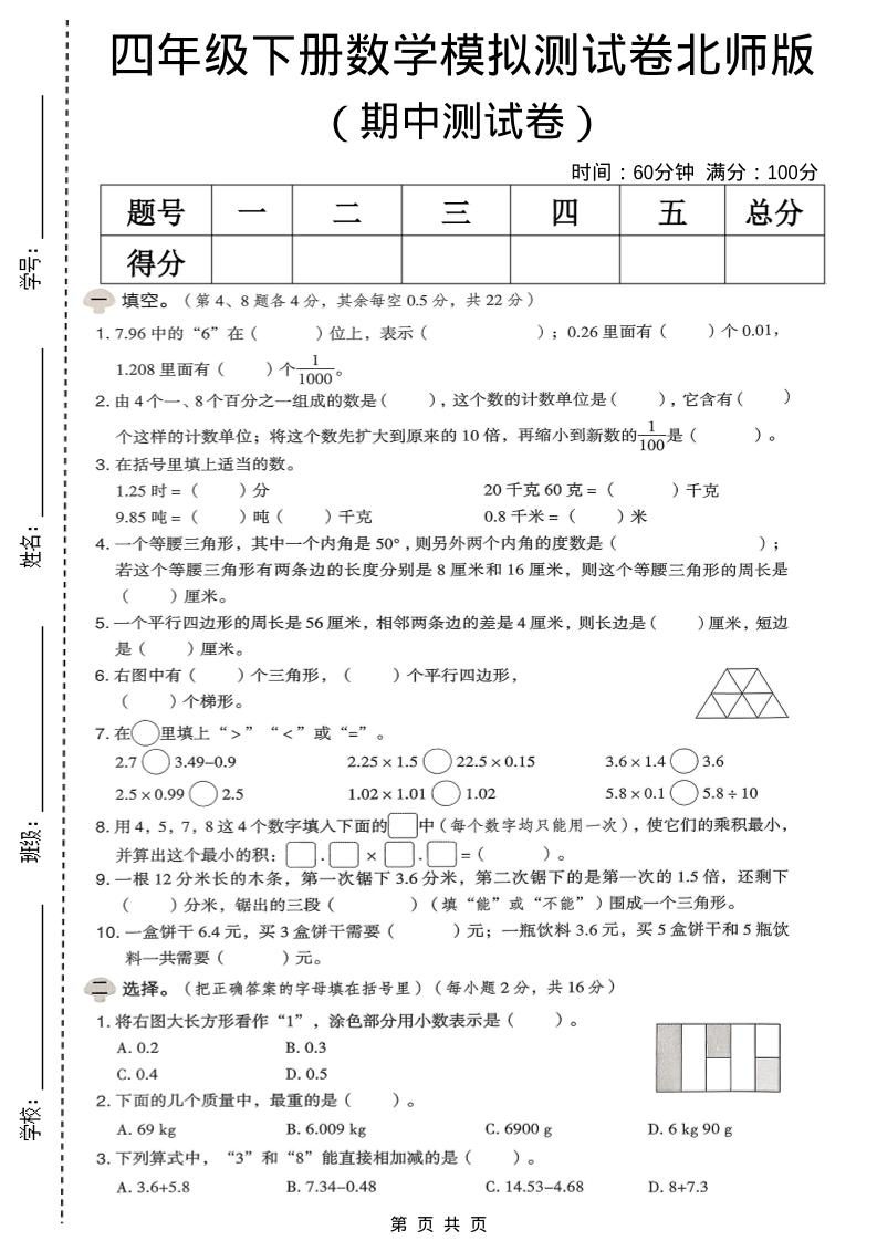 当前位置:首页学科年级四年级四年级下数学期中模拟测试卷《北师版》