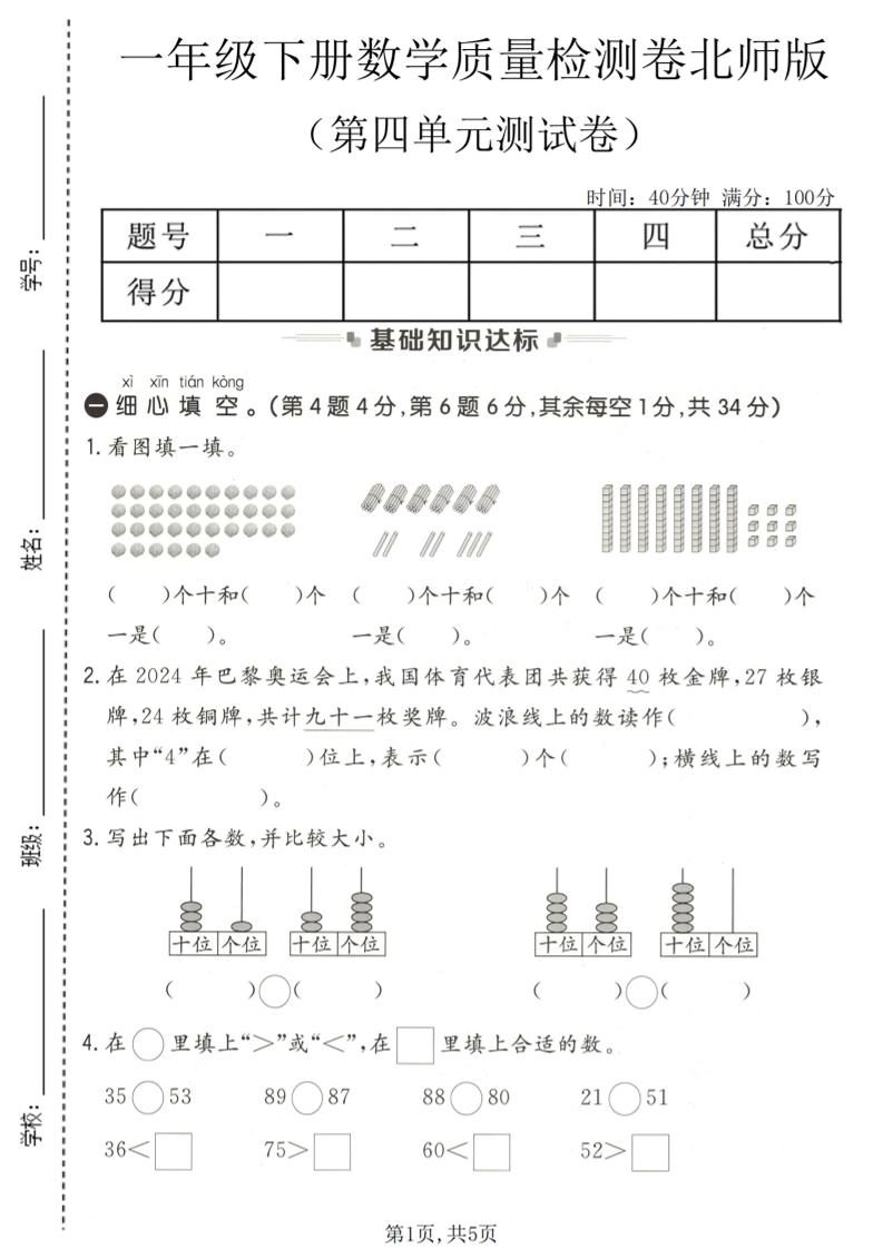 当前位置:首页学科年级一年级一年级下数学第四单元质量检测卷《北师版》
