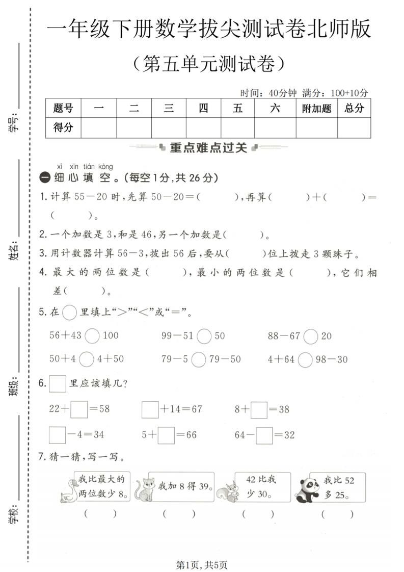 一年级下数学第五单元拔尖测试卷《北师版》