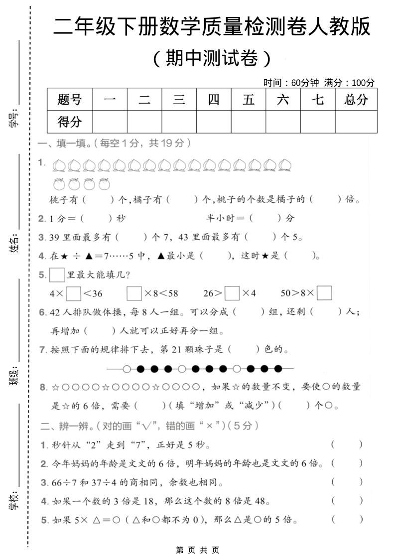 当前位置:首页学科年级二年级二年级下数学期中质量检测卷《人教版》