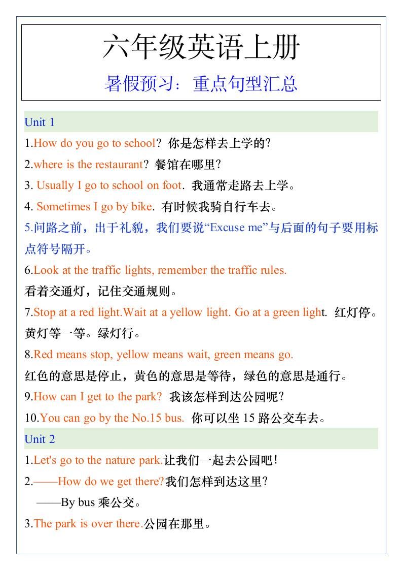 五升六年级英语上册暑假预习:重点句型汇总-六上英语