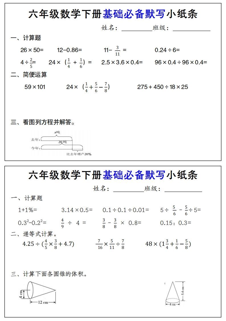 当前位置:首页学科年级六年级【基础必备默写小纸条】六下数学