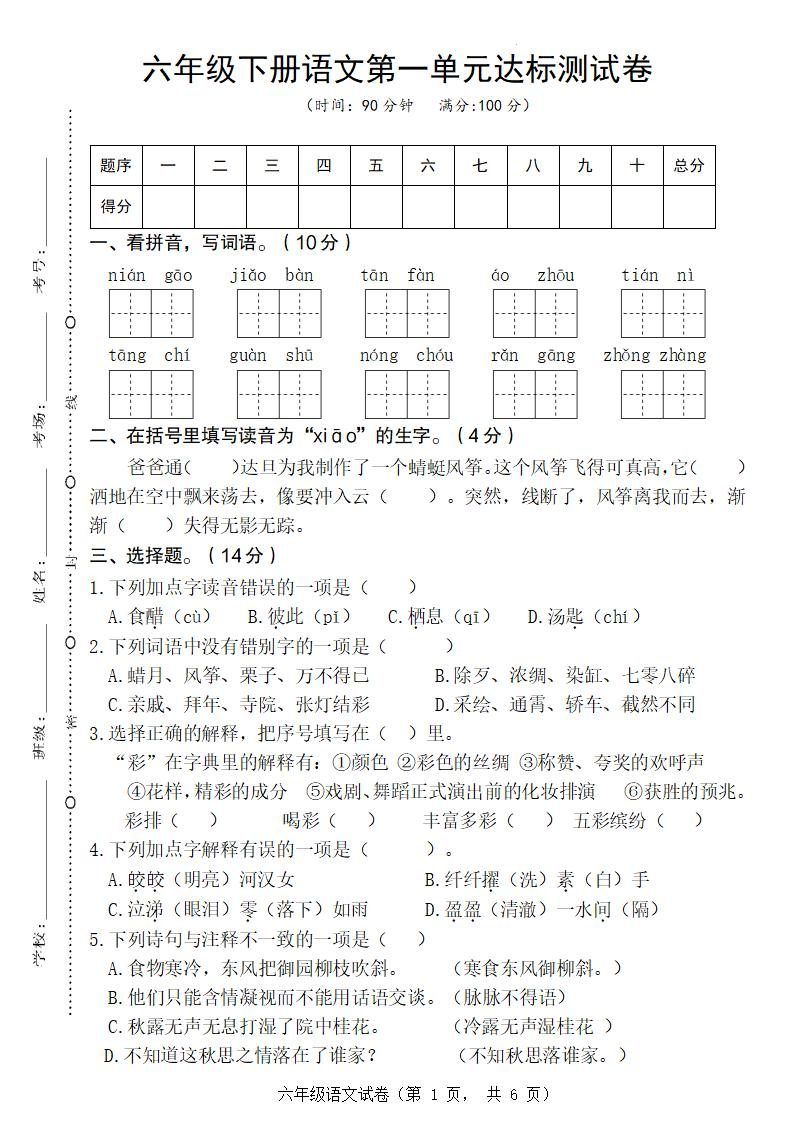 当前位置:首页学科年级六年级六年级下册语文第一单元达标测试卷
