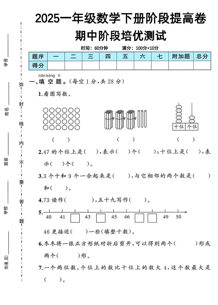 当前位置:首页学科年级一年级一下人教版数学期中阶段提高卷