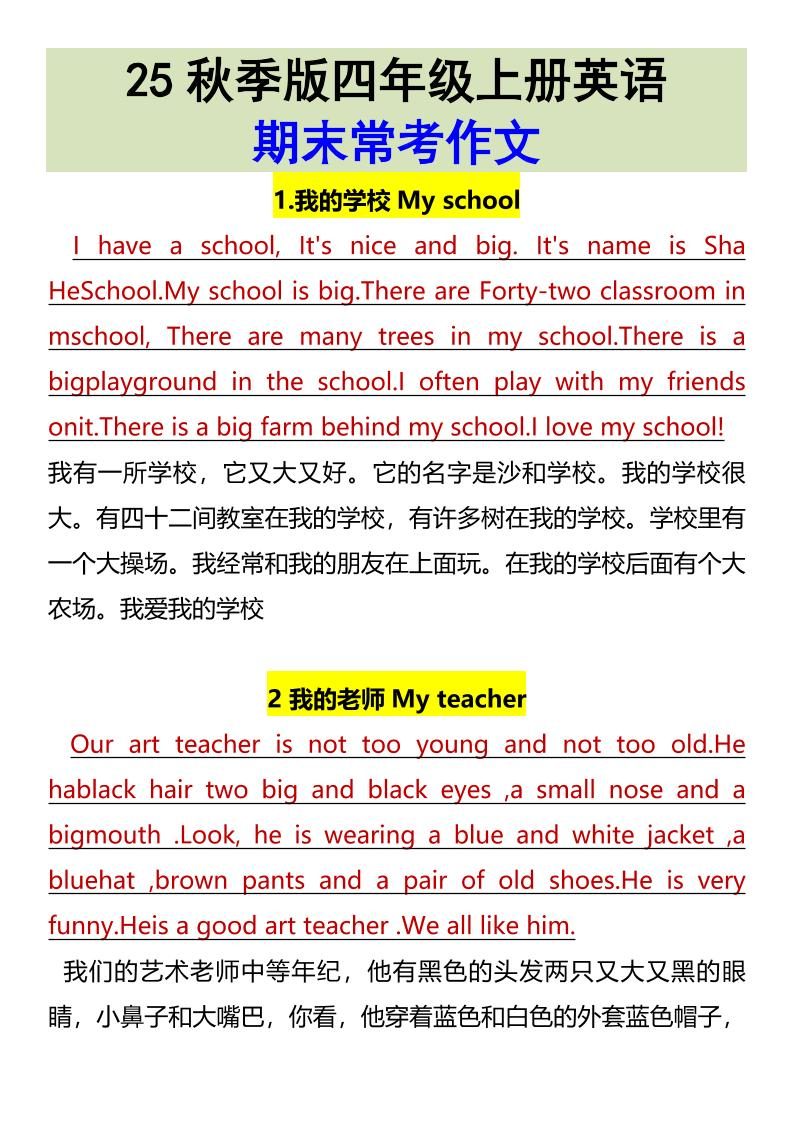 当前位置:首页学科年级四年级【2025秋新版】四年级上册英语•期末常考作文