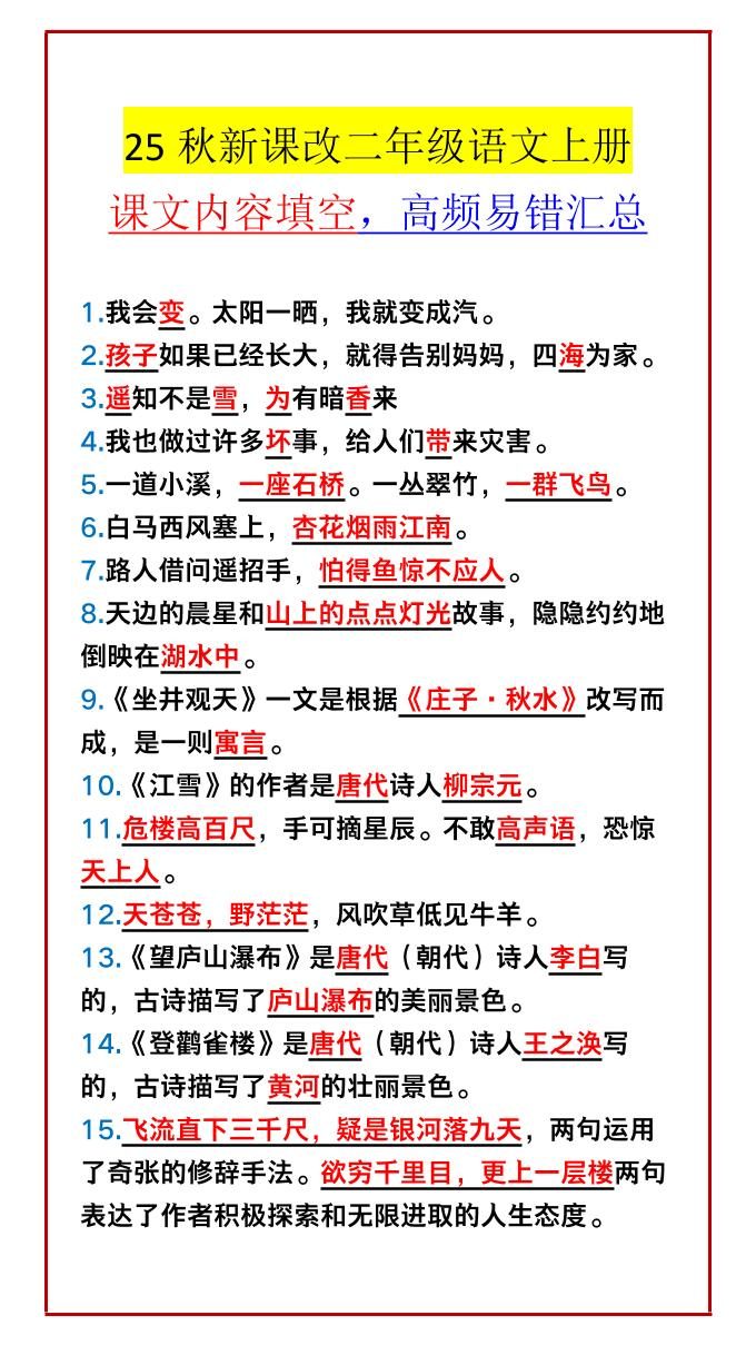 【2025秋新版】二年级语文上册课文内容填空,高频易错汇总