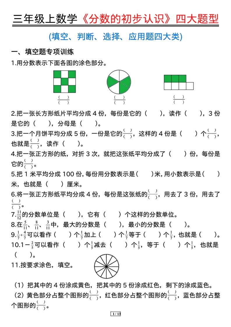 三上数学《分数的初步认识》四大题型(含答案13页)