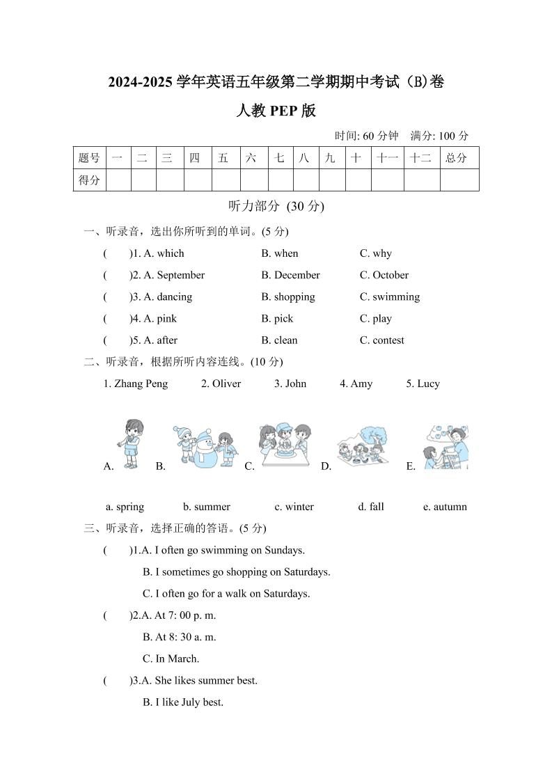 人教版2024-2025学年英语五年级第二学期期中考试(B)卷