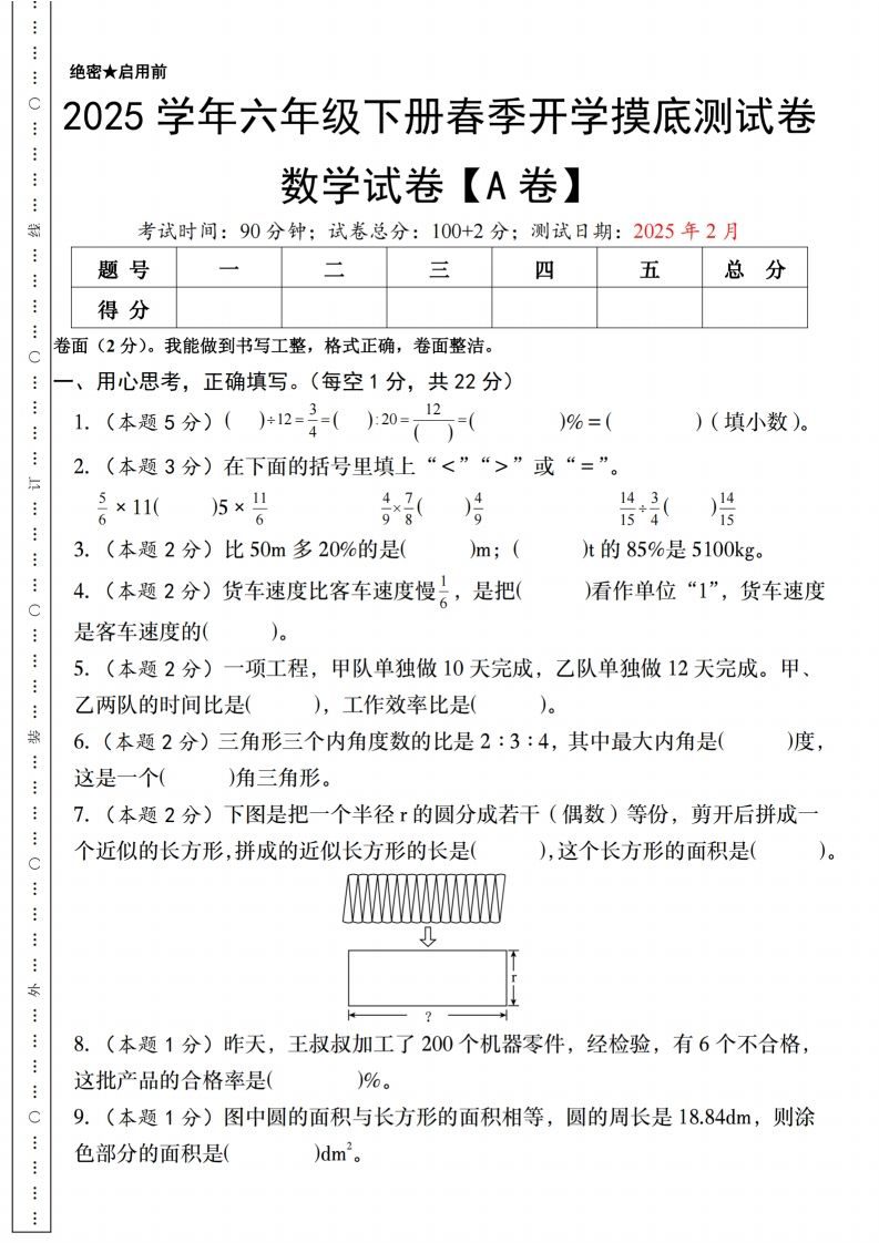 当前位置:首页学科年级六年级【人教版】2025学年六年级下册春季开学摸底测试卷数学试卷【A卷】
