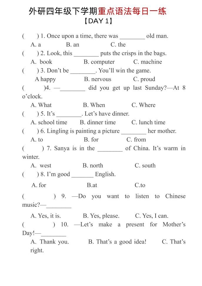 当前位置:首页学科年级四年级四年级下英语重点语法每日一练《外研版》