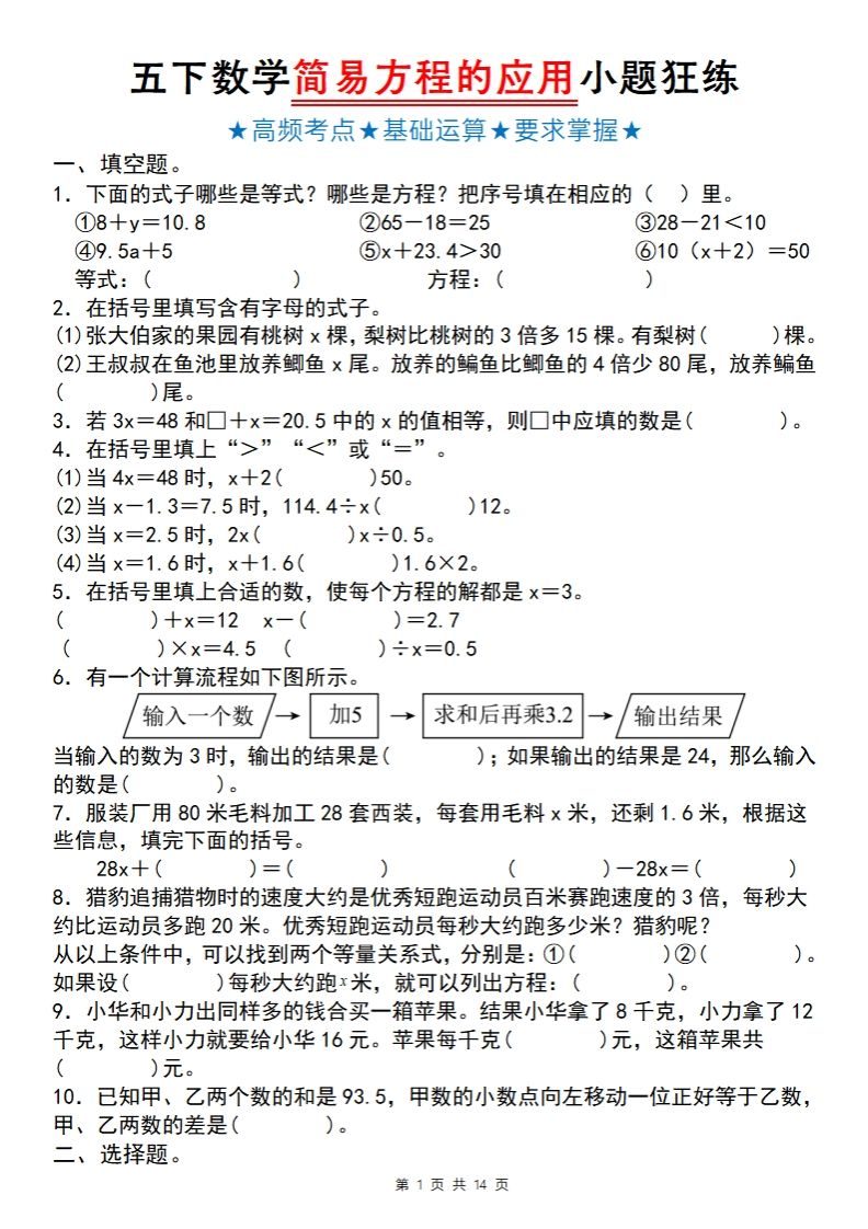 【苏教版】五下数学简易方程的应用小题狂练