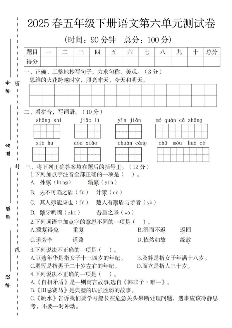 当前位置:首页学科年级五年级2025春五年级下册语文第六单元测试卷