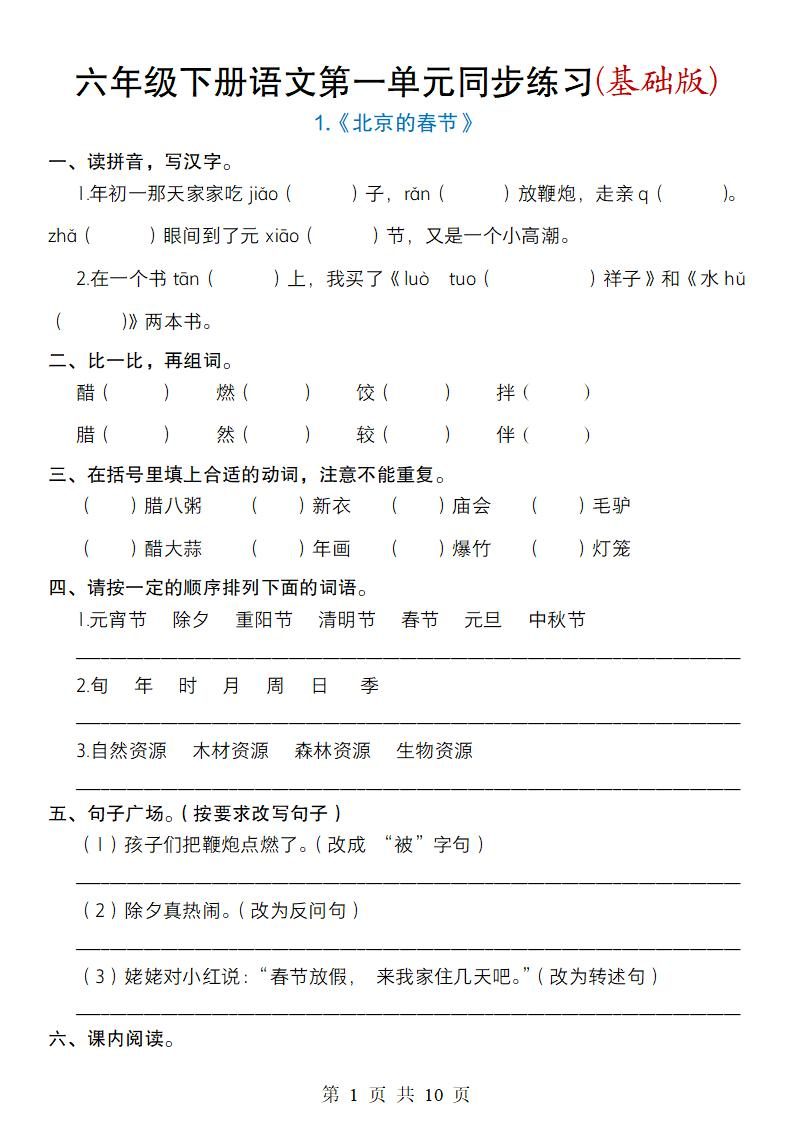 当前位置:首页学科年级六年级六年级下册语文第一单元同步练习(基础版)