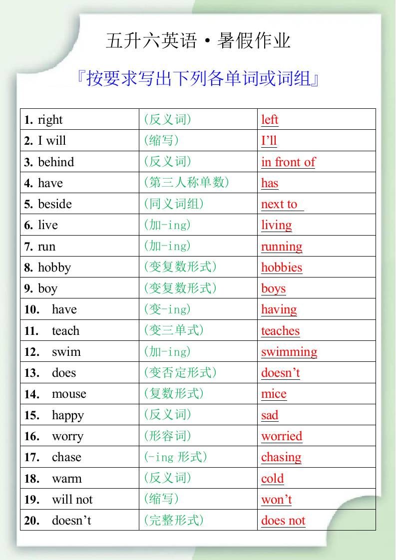 五升六英语暑假作业之按要求写出下列各单词或词组-六上英语