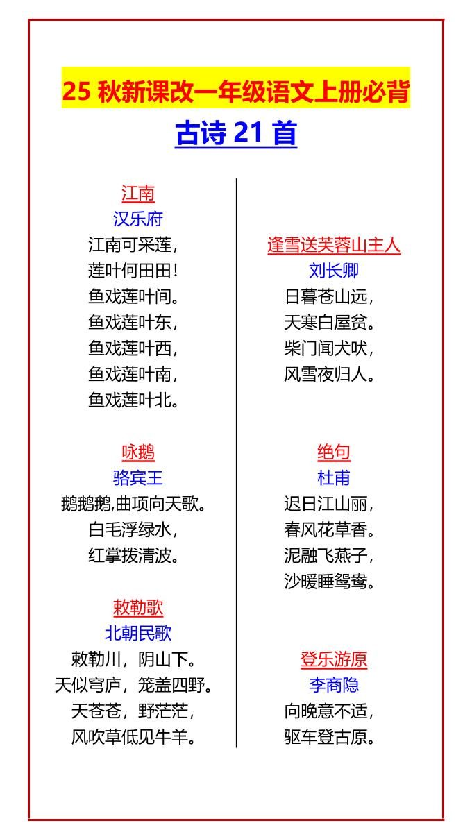【2025秋新版】一年级语文上册必背古诗21首