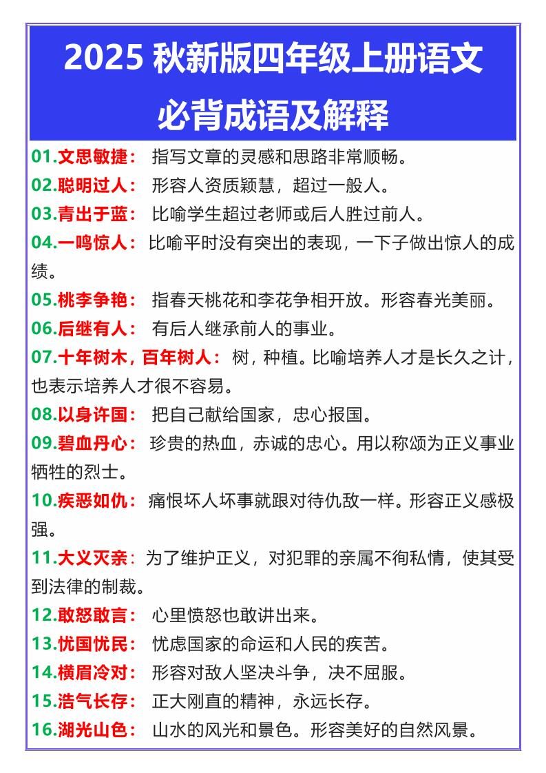 当前位置:首页学科年级四年级【2025秋新版】四年级上册语文必背成语及解释