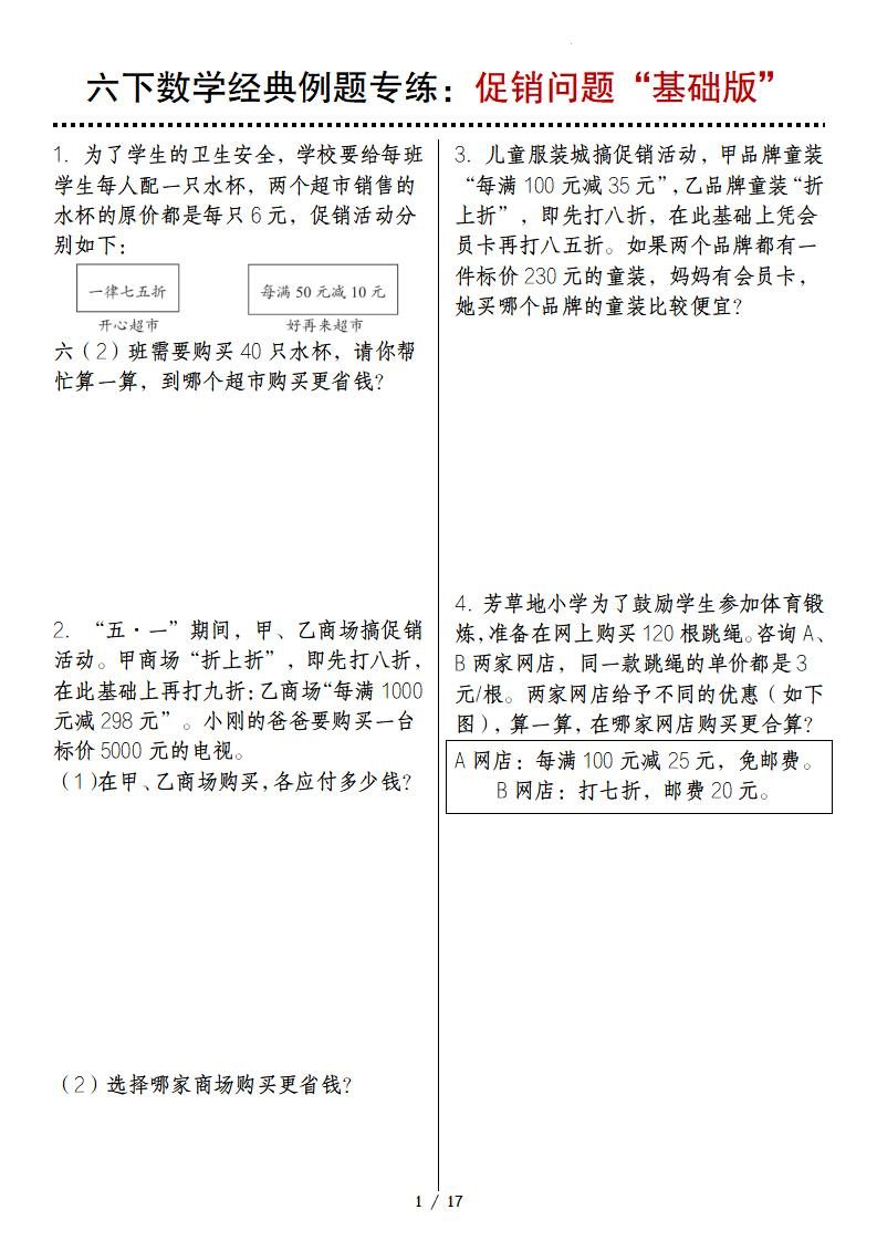 当前位置:首页学科年级六年级六下数学经典例题专练:促销问题“基础版”