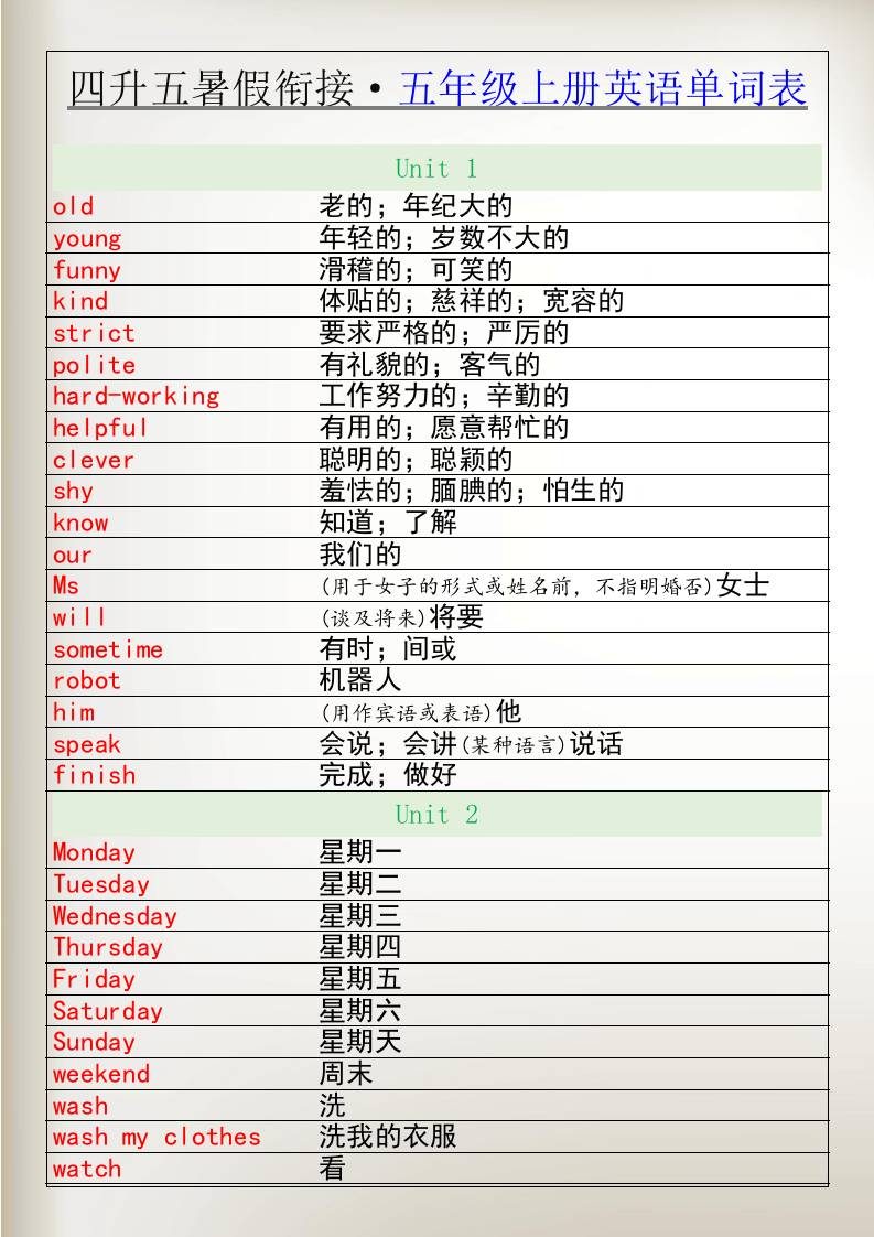 四升五暑假衔接五年级上册英语单词表-五上英语