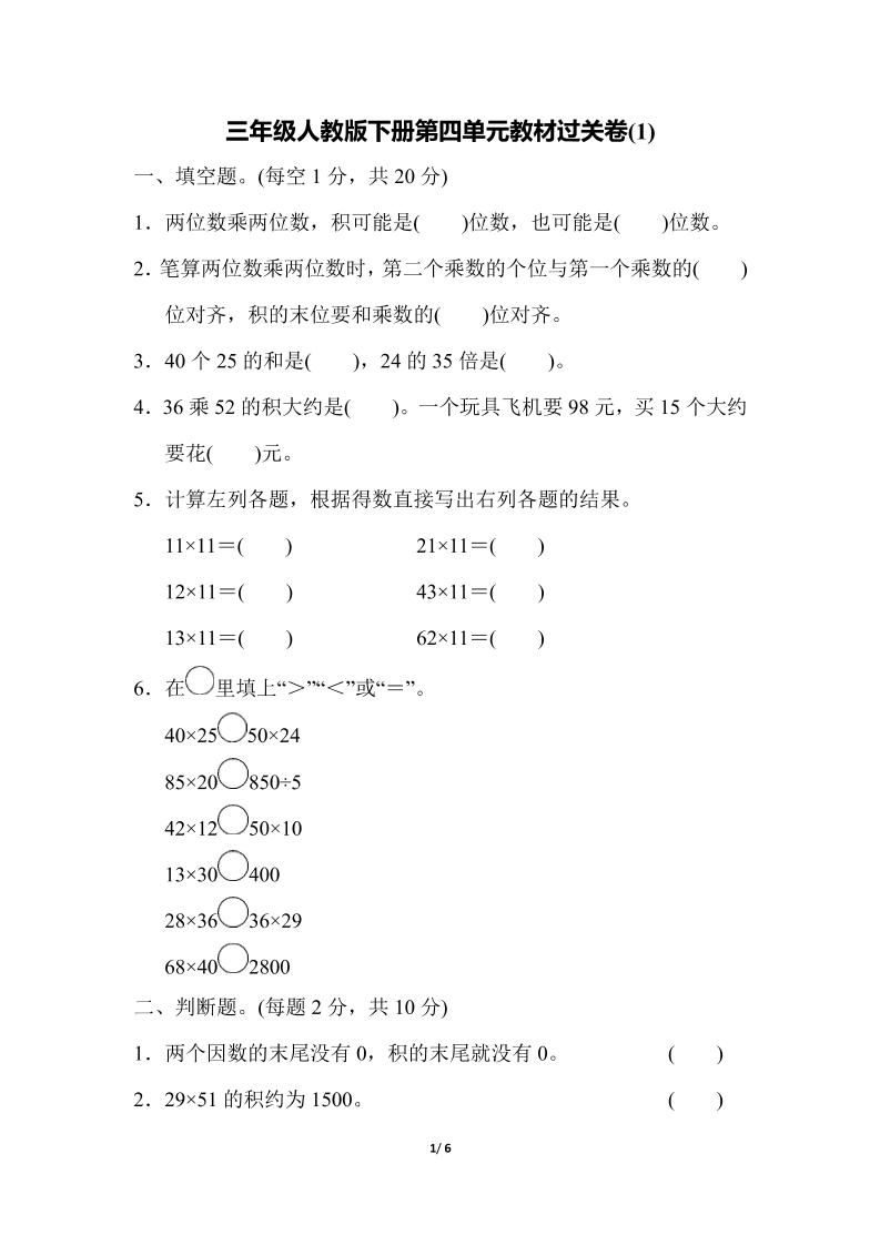 当前位置:首页学科年级三年级三下人教版数学第四单元教材过关卷-1