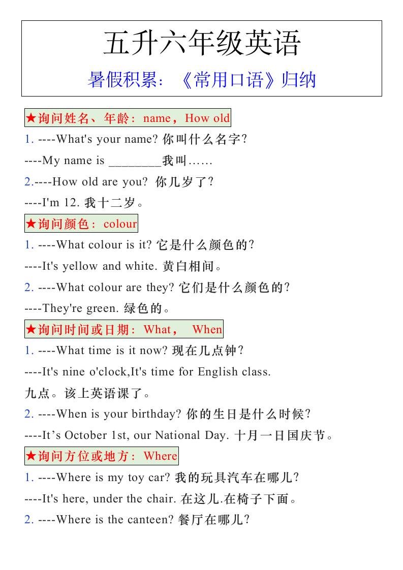 五升六年级英语暑假《常用口语》归纳-六上英语