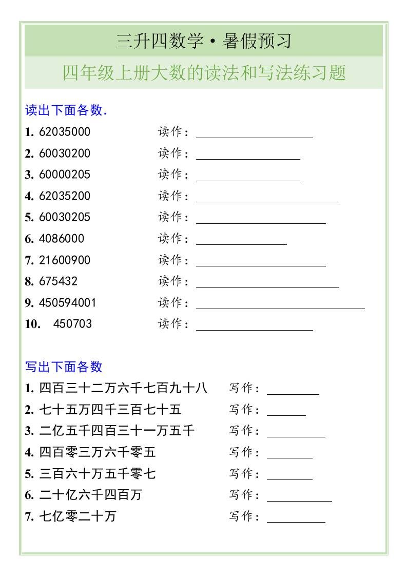 三升四数学暑假衔接——四年级上册大数的读法和写法练习题-四上数学