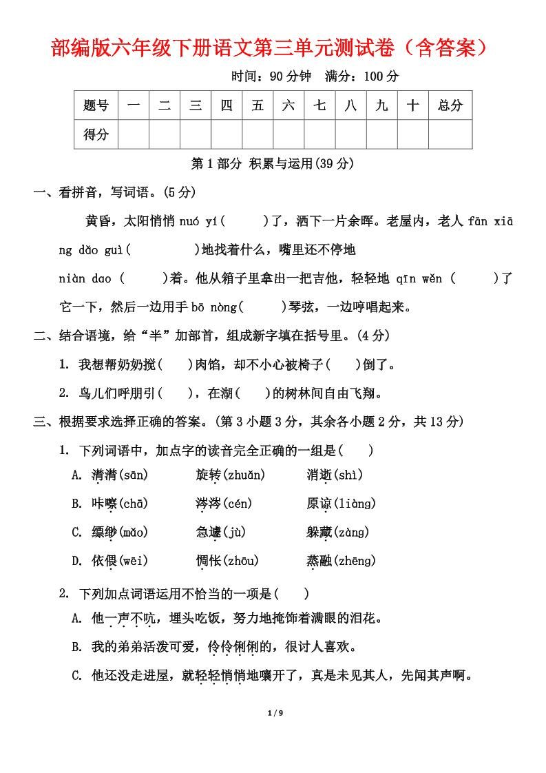 当前位置:首页学科年级六年级部编版六年级下册语文第三单元测试卷(含答案)