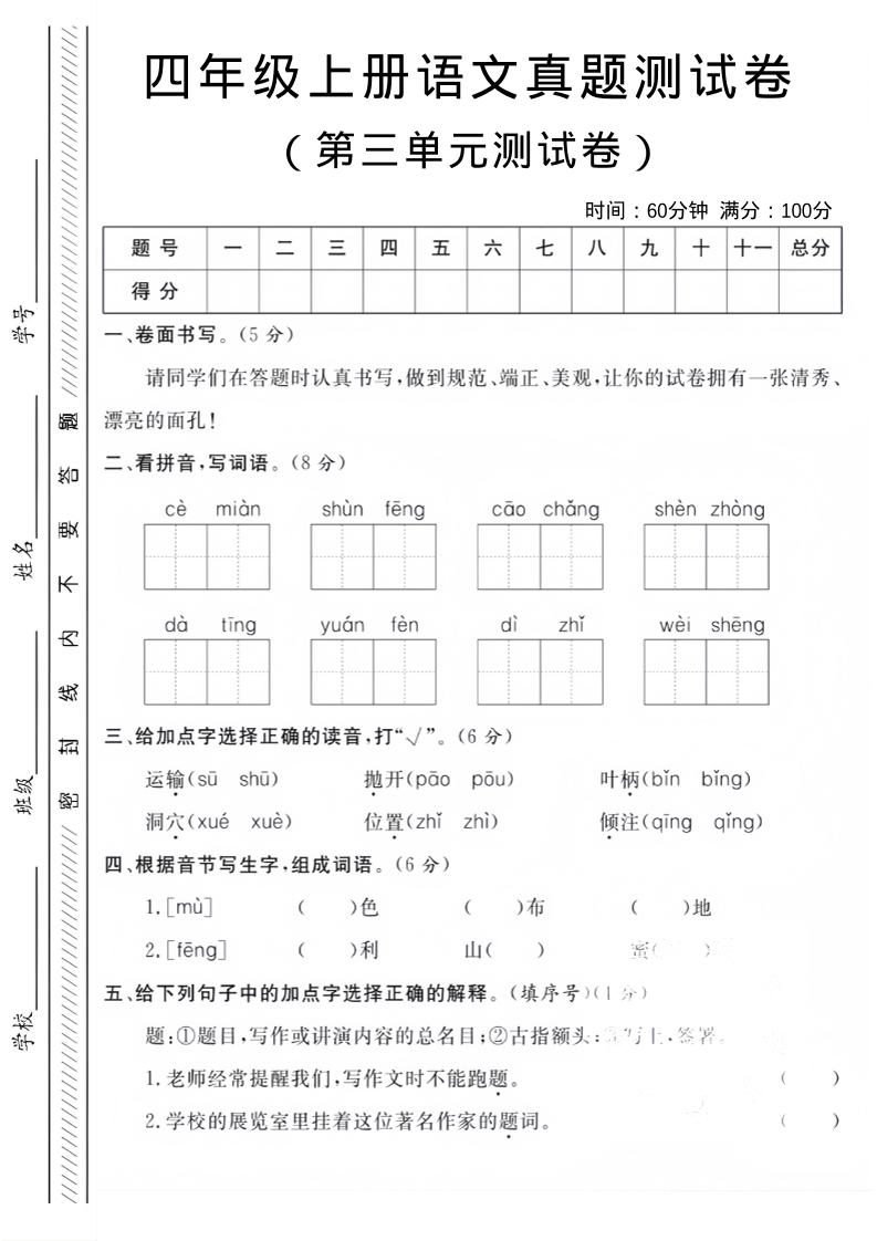 25学年一上语文第三单元综合测试卷(含答案5页)