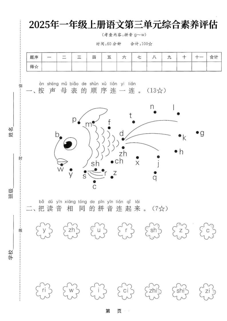25学年一上语文第三单元综合素养评估卷(含答案5页)