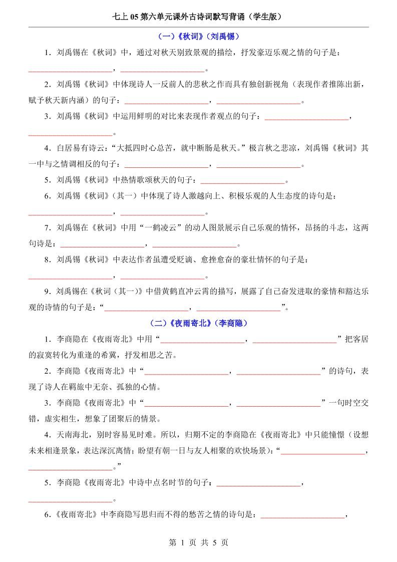 当前位置:首页学科年级七年级七年级上语文第6单元课外古诗词默写背诵