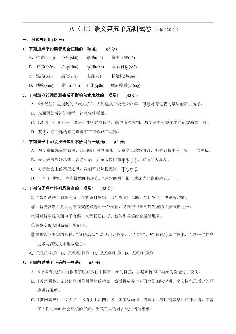 八年级上语文第5单元测试卷