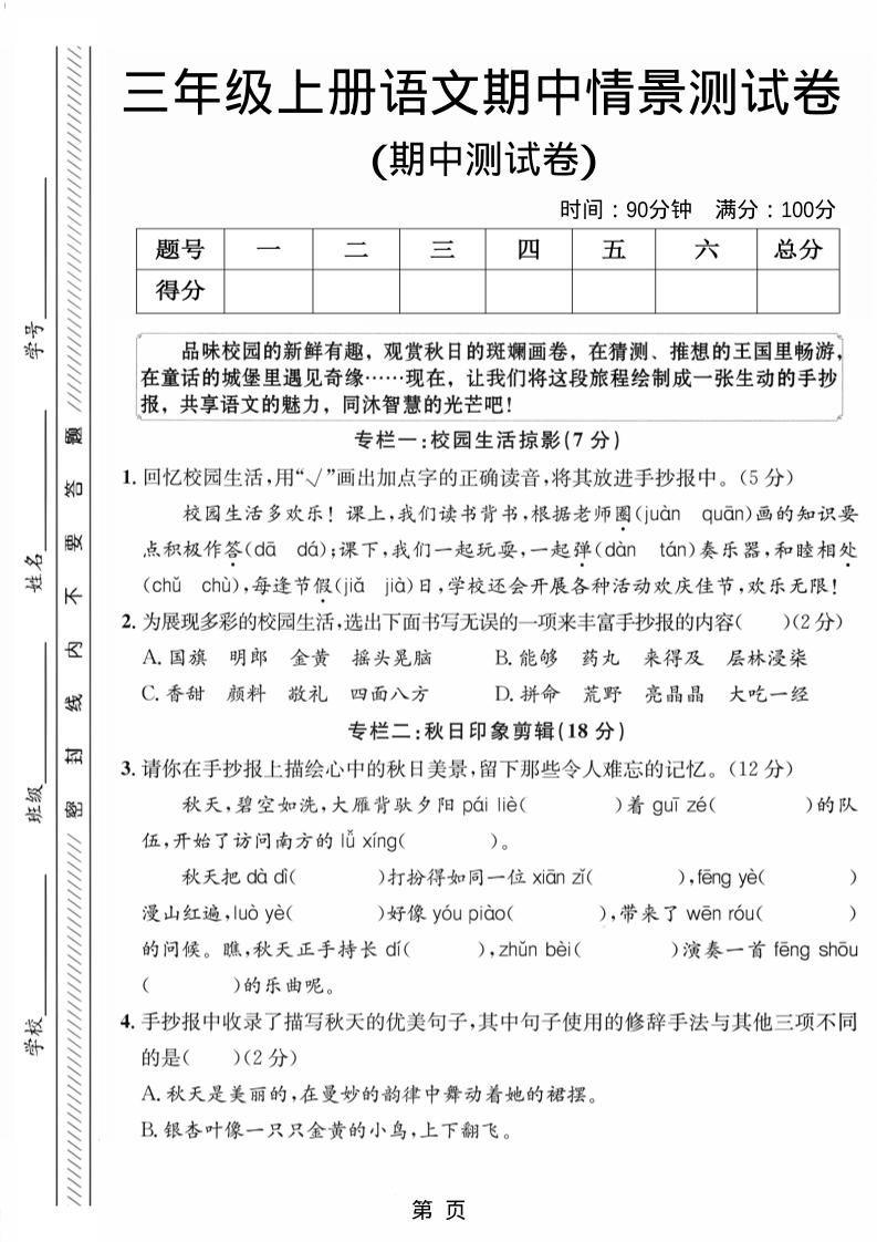 三年级上册语文期中情景测试卷1