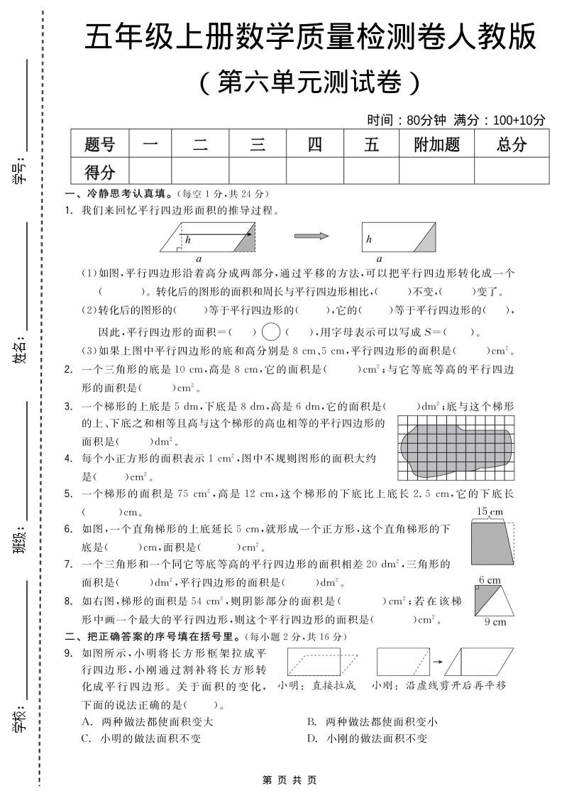 五年级上数学第六单元测试卷《人教版》