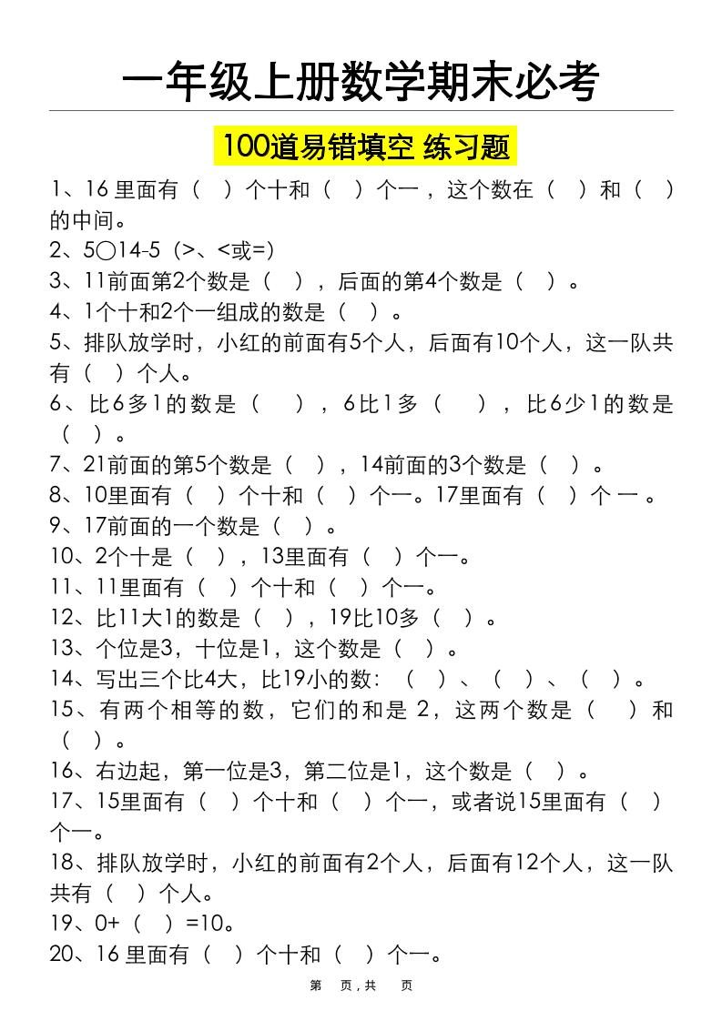 当前位置:首页学科年级一年级一上数学期末必考100道易错填空练习题(空白+答案)